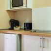 Comodidades modernas: Aire acondicionado para garantizar tu confort y una zona de cocina equipada con microondas, frigorífico y cafetera.